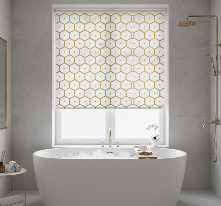 The Bathroom blind with hexagonal gold marble design bathroom blind is an exceptional choice for decoration, transforming your bathroom into a chic and inviting space. With its sophisticated design, this blind enhances the overall ambiance, making it a delightful focal point. Imagine stepping into a bathroom that exudes style and luxury, all thanks to this remarkable blind!