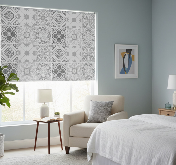 Reference: E9898Transform your space with our stunning Blind bedroom moroccan gray tile pattern. This exquisite design features intricate Moroccan patterns in a soothing gray hue, creating a visually appealing backdrop that adds elegance and sophistication to any bedroom. The perfect blend of style and functionality, this roller blind not only enhances your decor but also provides essential features like easy cleaning, protection from direct sunlight, and privacy when lowered.