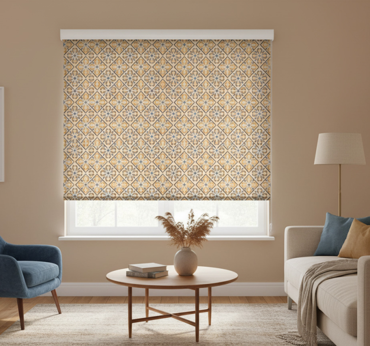 Reference: E9823Introducing our stunning Blind beige with gold and blue baroque design, a captivating blend of elegance and functionality! This exquisite roller blind features a luxurious baroque pattern adorned in rich gold and deep blue hues, perfectly set against a soft beige background. The intricate design not only enhances the aesthetic appeal of your space but also provides practical benefits, including protection from direct sunlight and improved privacy. With easy assembly in just two clicks, this roller blind is designed for your convenience.