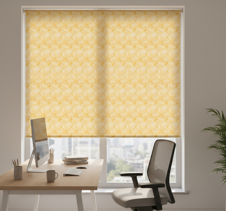 Reference: E7304The Blind office gold foil wave illusion is a stunning roller blind that melds elegance with functionality. Featuring a mesmerizing gold foil wave design, this blind adds an artistic flair to any office space while also serving practical purposes. Its easy assembly in just two clicks ensures that you can enhance your décor without any hassle. Not only does it protect your room from harsh sunlight, but it also provides an excellent level of privacy when lowered. The innovative design allows the room temperature to be regulated, creating a comfortable atmosphere for productivity.