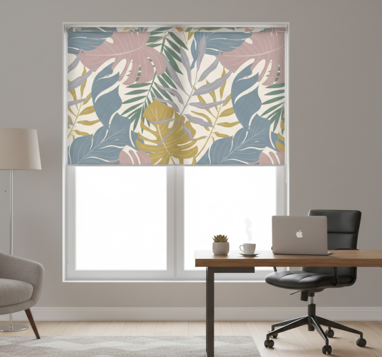 Home office blind with tropical leaf design