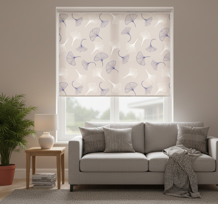 Reference: E9574Transform your living space with our stunning Living room blind ginkgo leaves cream. This elegant design features a gentle cream background adorned with intricate ginkgo leaf patterns that evoke a sense of tranquility and nature. Perfectly balancing aesthetics and functionality, this roller blind not only enhances your home decor but also provides essential benefits like light control and privacy.