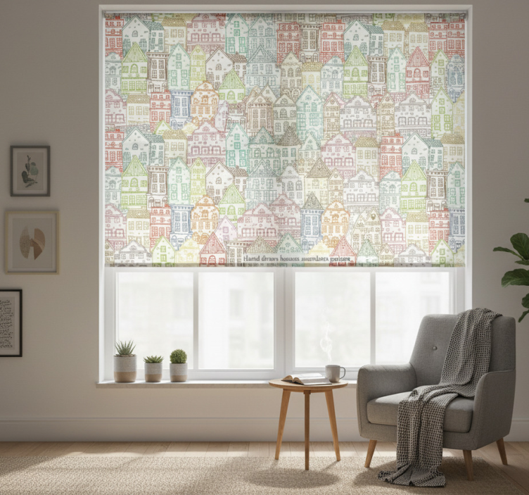 The Modern blind with hand-drawn houses pattern modern blind transforms any room into a cozy retreat! Its artistic representation of charming houses inspires warmth and creativity, making it an ideal choice for those looking to enhance their home decor. Imagine sipping your morning coffee while surrounded by the delightful imagery of quaint homes, creating a welcoming atmosphere that reflects your unique style. This roller blind not only beautifies your space but also serves a practical purpose by providing privacy and regulating light, making it a must-have for your interior design!