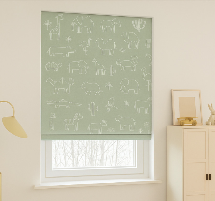 Reference: E6074Introducing our stunning Scandinavian blind jungle animals outline, designed to bring a touch of nature into your home! This unique roller blind features a charming array of stylized jungle animals, set against a minimalist Scandinavian backdrop. The elegant design is perfect for those who appreciate modern aesthetics while wanting to foster a warm, inviting atmosphere. With its easy assembly in just two clicks, cleaning made simple, and customizable measurements, this blind not only enhances the beauty of your space but also offers practical benefits!