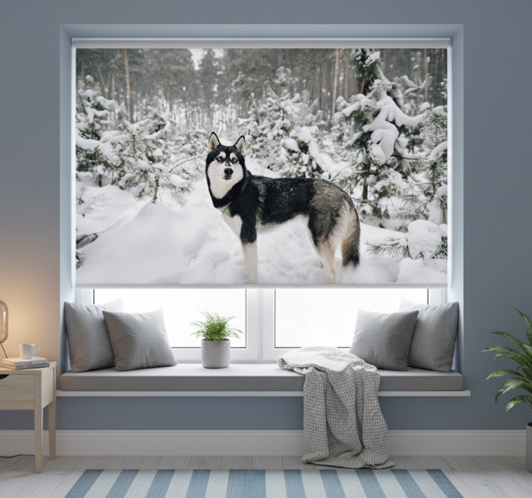 Reference: E9952Introducing our stunning White window blind winter forest and husky dog, beautifully designed to transform your living space into a serene winter wonderland. This roller blind features a captivating scene of a husky dog amidst a tranquil winter forest, creating a cozy atmosphere while effectively filtering natural light. With easy assembly in just two clicks, effortless cleaning, and a customizable look, this blind is a must-have for anyone looking to elevate their home decor!