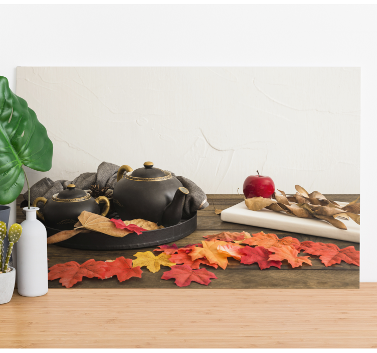 Introducing our stunning Autumn Tea Arrangement landscape canvas, a perfect blend of rustic charm and artistic elegance! This captivating design features beautifully illustrated teapots, a rustic table adorned with autumn leaves, and a delightful still life scene, including a tempting apple. It effortlessly captures the essence of autumn, bringing warmth and vibrancy to any space.