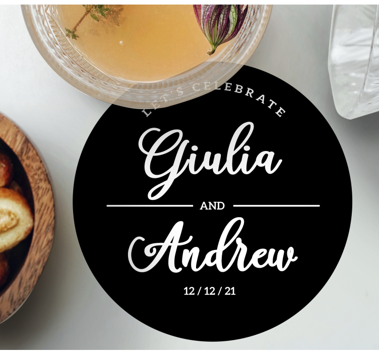 Get this design to make that really important night your night. The design is elegant and great, and affordable for getting custom decorations. The best thing is that you can keep it, it is not rented! Talking about that, if you have rented tables for your party goers, with this product you can make sure they don't get scratches, stains, watermarks, or anything else. This coaster with an elegant design and custom text for the wedding has a black background and custom text with details. Make sure to order enough packs and pick the size!