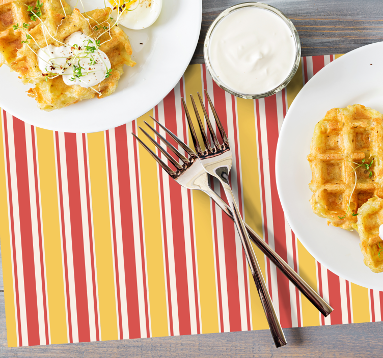 Reference: M4636Bright and colorful striped pattern featuring yellow, red, and white lines. This cheerful design adds a fun and lively touch to any setting, perfect for children’s gatherings or casual family meals, enhancing the dining experience with its vibrant colors.