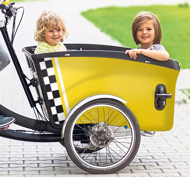 Introducing our vibrant Bike sticker yellow taxi design that captures the playful spirit of a yellow taxi cab! This delightful design features a fun and charming graphic that is perfect for any bike, especially a bakfiets used for transporting children. The bright yellow color adds a splash of joy, making your bike not just a mode of transport but also a delightful sight on the road!