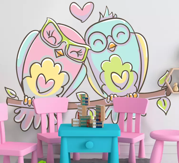 Introducing our Bird sticker adorable love birds, a delightful design that features a charming couple of happy owls, beautifully illustrated in soft pink and blue hues. This cute artwork captures the essence of love and companionship, making it perfect for any space that needs a touch of whimsy and warmth!