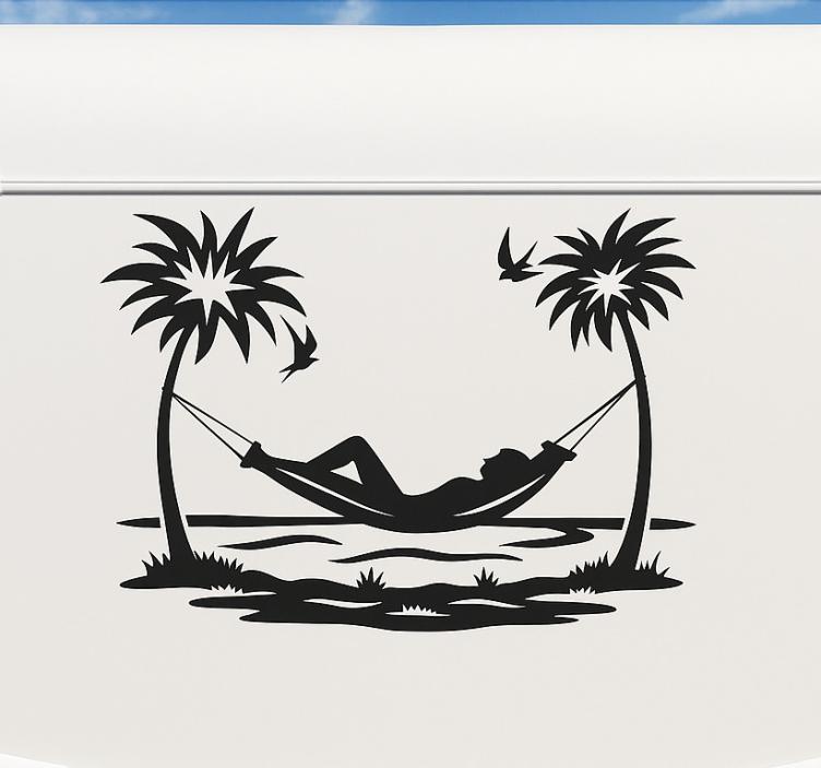 Reference: A54326Introducing our vibrant Campervan decal beach life hammock, a perfect blend of adventure and relaxation! This design beautifully captures the essence of beach life, featuring a hammock swaying between palm trees against a stunning sunset backdrop. The colors are rich and inviting, making it an ideal decoration for any campervan enthusiast looking to bring a touch of the coast into their travels.