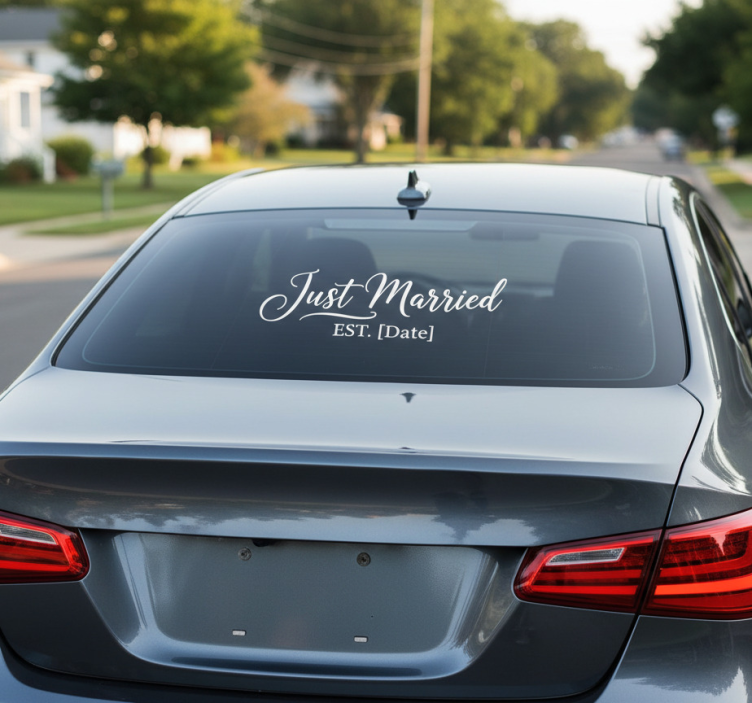 Reference: A54572Introducing our delightful Car sticker just married decal, a charming design that beautifully captures the joy of your special day! This sticker features elegant typography and whimsical elements that evoke a sense of celebration and love. Its durable vinyl material ensures a long-lasting presence on your vehicle, while the satin finish enhances color intensity without reflections, making it a perfect choice for any newlywed couple.
