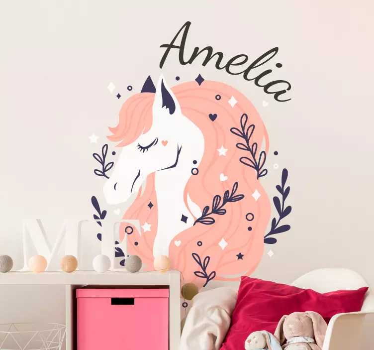 Reference: A46837Featuring a charming unicorn with flowing mane and delicate floral accents, this design adds a whimsical touch to a child's space. Customizable for added personalization, it captures a sense of magic and warmth, making it ideal for nurseries or playrooms.
