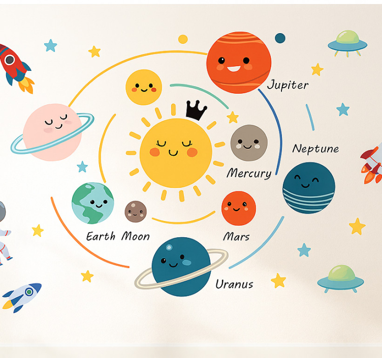 Reference: A54265Transform your child's space with our Childrens' wall stickers planet wall kids, featuring a vibrant design that brings the universe to life! Each sticker showcases playful planets, twinkling stars, and whimsical rockets, creating an enchanting atmosphere that sparks imagination and creativity. The colorful graphics are perfect for inspiring little dreamers and explorers!