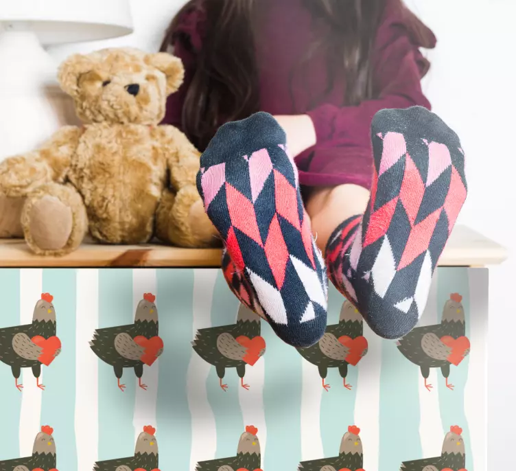 Introducing our Farm animal sticker charming chicken design, a delightful addition to any space! This charming design features a playful rooster surrounded by cute roosters, hearts, and colorful stripes that create a fun pattern. Perfect for adding a touch of farmhouse charm to your furniture and decor, this vibrant sticker brings the essence of farm life right into your home!