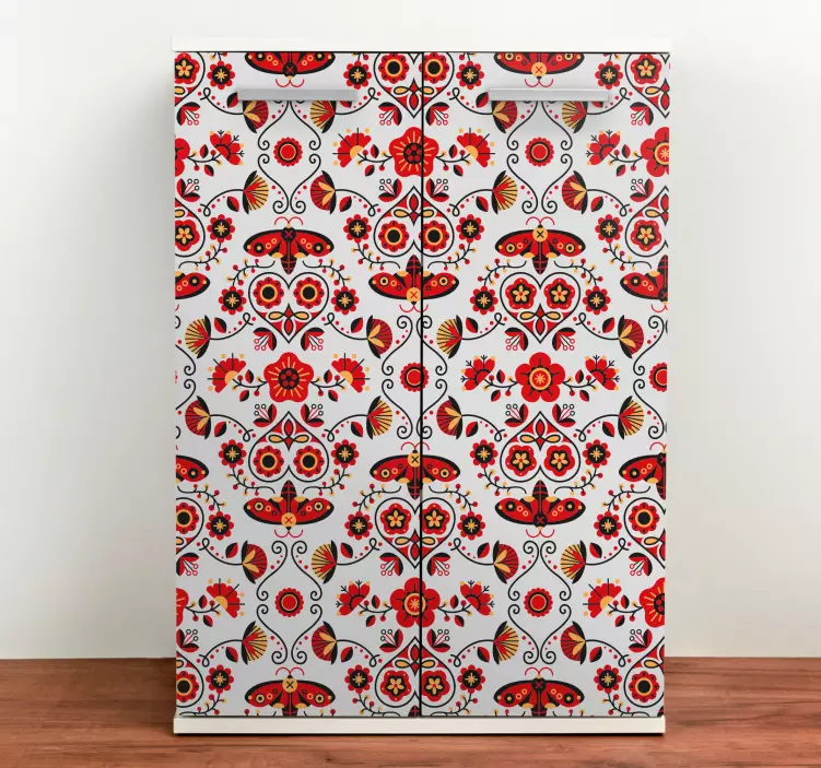 Introducing our Fridge sticker botanical design artwork, a stunning piece that brings the beauty of nature into your kitchen! This vibrant design features a delightful array of folk motifs, including butterflies and flowers, creating a colorful and ornate pattern that enhances any decor. Its lively portrayal of nature transforms your fridge into a captivating piece of furniture art, making every glance a joyful experience!