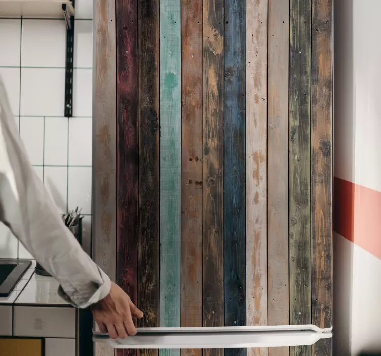 Transform your kitchen with our stunning Fridge sticker country style wooden planks. This design features a beautiful array of colorful painted vertical planks that evoke a rustic charm, perfect for adding a touch of warmth and personality to your interior space. The textured wood finish brings a sense of nature indoors, making it a delightful addition to your home.