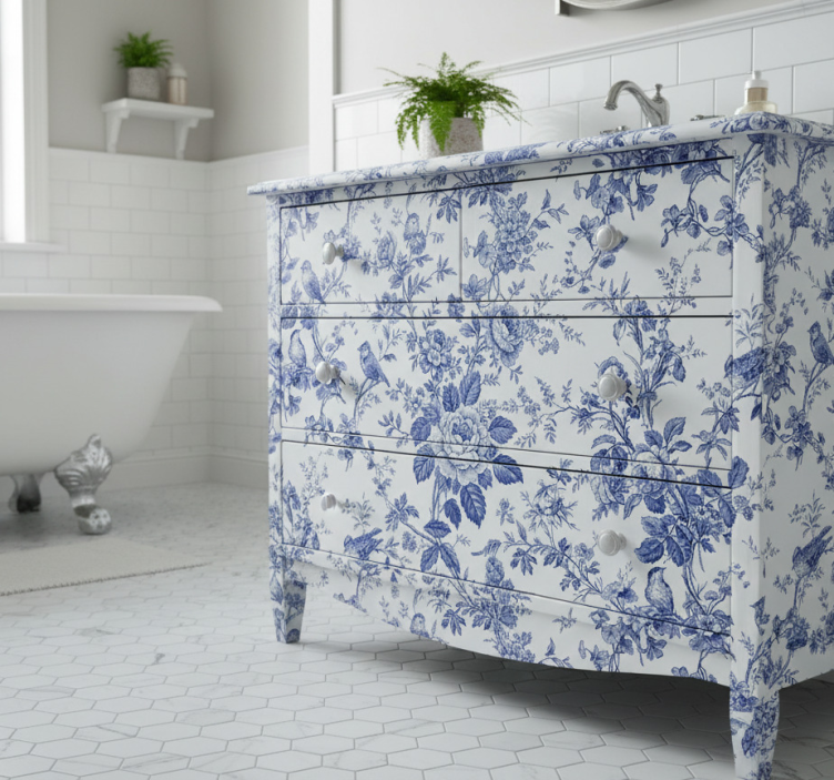 Reference: A54885Transform your space with the enchanting Furniture sticker blue toile floral songbirds. This stunning design features delicate floral patterns intertwined with whimsical songbirds, creating a serene and inviting atmosphere. The soothing blue tones bring a touch of elegance, making it a perfect addition to any room.