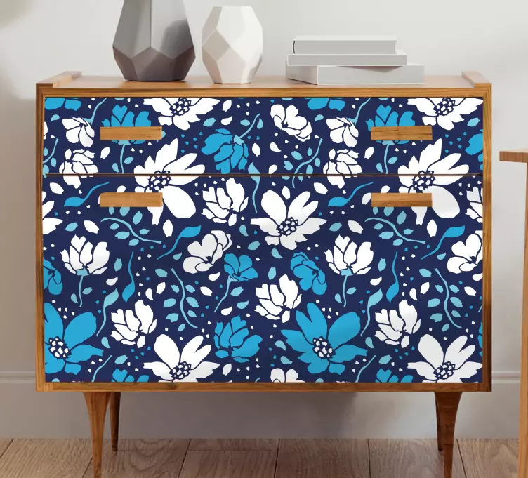 Transform your space with our stunning Furniture sticker floral motif drawers. This exquisite design features a delightful arrangement of daisies, florals, and vibrant flowers in a charming blue and white color palette. Each pattern is intricately designed to evoke a sense of nature, making it the perfect addition to any furniture piece. The leaves intertwine beautifully with the blossoms, creating a fresh and uplifting atmosphere!