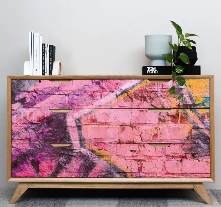 Transform your space with our Furniture sticker vibrant colorful energy, a stunning piece of art that embodies a vibrant blend of brick wall aesthetics and graffiti influences. This street art inspired design bursts with a kaleidoscope of colors, featuring energetic pink geometric patterns that bring a contemporary urban feel to any furniture surface. The artistic texture adds depth and character, making it perfect for those who appreciate urban art and want to infuse their home with a sense of creativity and individuality!