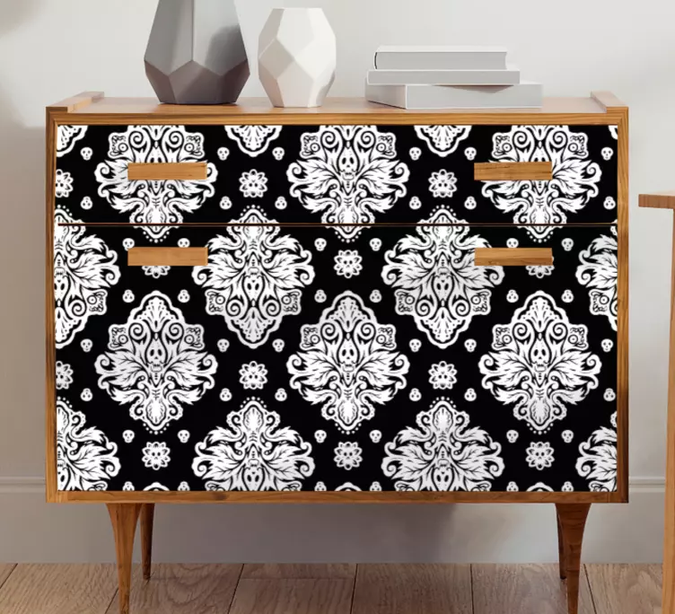 Transform your living space with our Furniture sticker with elegant pattern design, a stunning blend of intricate skulls, enchanting florals, and classic damask patterns, all presented in striking black and white. This ornate pattern brings a modern style to your home interior, making it a perfect addition to any furniture design. Each sticker offers a unique style that captivates and elevates your decor!