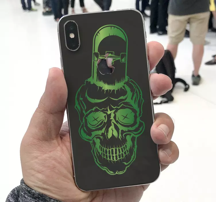 The Iphone sticker green skull design features a vibrant green skull character that effortlessly combines edgy style with a playful twist. This design, inspired by skate culture, showcases a unique blend of a phone and a skateboard, making it a perfect accessory for those who want to stand out!