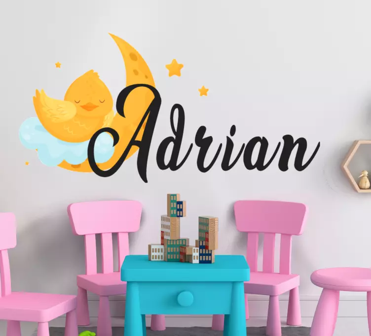 The Kid's sticker cute moon design is a delightful illustration featuring a charming chick nestled against a serene moon, surrounded by twinkling stars and fluffy clouds. This enchanting design is perfect for personalizing your child's room with a custom name, adding a magical touch to their space. It's a fantastic way to create a cozy atmosphere while inspiring sweet dreams!