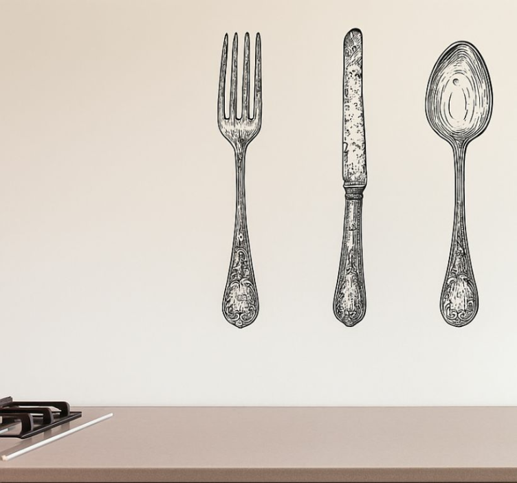 Reference: A54290Introducing our Kitchen wall sticker grey cutlery design, a stunning addition to your culinary space! This design features an elegant arrangement of grey cutlery, including forks, knives, and spoons, creating a sophisticated yet inviting atmosphere in any kitchen. The artistic flair of this wall sticker brings a modern touch to your home decor, effortlessly blending functionality with style.
