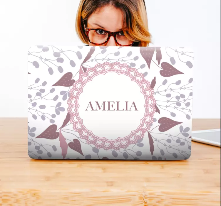 Transform your laptop into a stunning piece of art with our Laptop skin with personalized botanical design. This exquisite design features an elegant mix of leaves, hearts, and twigs, creating a beautiful floral pattern that reflects your unique style. It’s customizable, allowing you to add your own text, making it truly one-of-a-kind!
