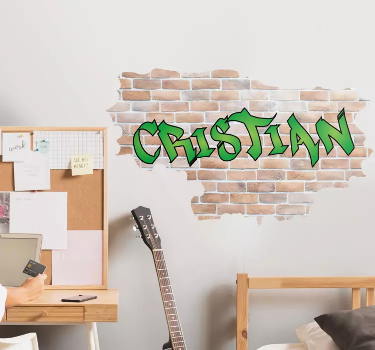 Transform your space with our stunning Location sticker customized urban wall design! This unique wall art features a vibrant brick wall backdrop, personalized with your choice of custom name, making it a perfect piece for those who appreciate graffiti, street art, and urban art. The design brings together a rich combination of green tones and dynamic grafiti styles to create an eye-catching centerpiece that speaks to your individual style and personality.