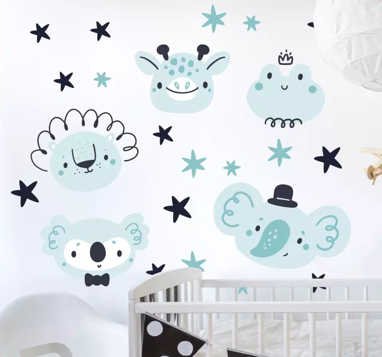 Reference: A53808Adorable animal representations enhance any children's space with their playful and whimsical nature. Featuring a variety of cute characters and star motifs, this design invites a sense of joy and imagination, making it perfect for nurseries or playrooms.