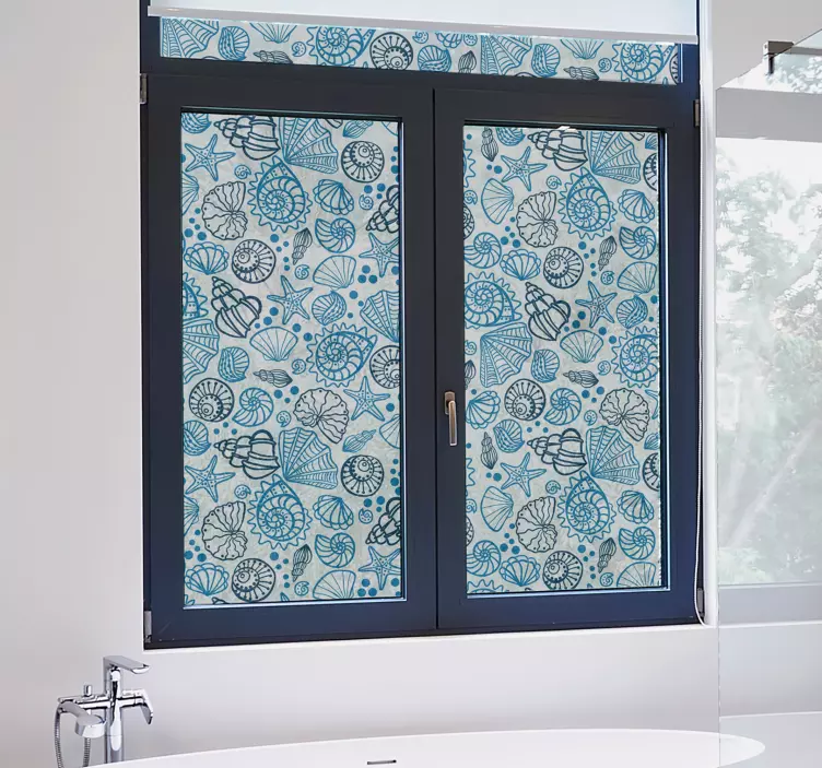 Transform your bathroom, bedroom, or any surface in your home with this translucent shell sea fish window decal. Featuring stunning sea animal life such as starfish, snail, octopus, and jellyfish, this design is created on a white background with all its contents in blue color.