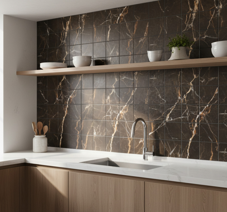 Reference: A54982Transform your space with our stunning Tile sticker black and golden marble design. Featuring an exquisite blend of black and golden tones, this design captures the essence of luxury and sophistication. The intricate marble pattern creates a dynamic visual appeal that is both modern and timeless, making it the perfect addition to any decor.