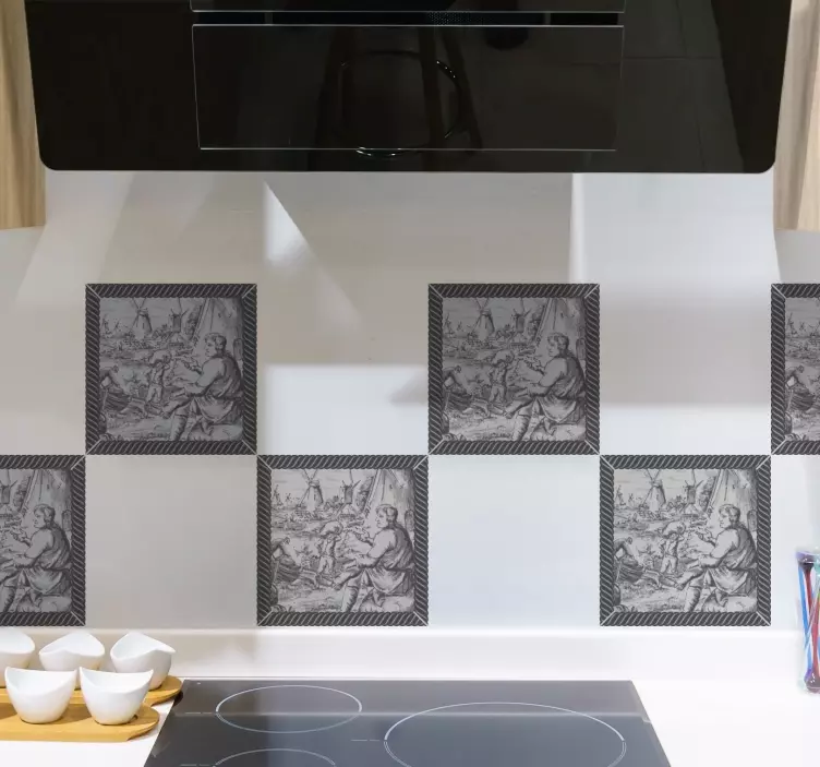 Transform your space with our Tile sticker historic scene tiles, beautifully designed to capture the essence of craftsmanship and artistry. Featuring a stunning black and white depiction of working men and mills, these tiles present a rich cultural landscape that tells a story. Each sticker encapsulates a historic scene, offering a unique touch of elegance and sophistication to any decor.