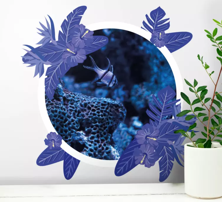Transform your space with the stunning Wall sticker frame underwater exploration scene! This beautiful design features vibrant florals, colorful coral, and playful fish set against a soothing blue backdrop that captures the essence of tropical nature. The round frame design allows for a custom photo to be placed at its center, inviting a touch of the ocean's charm into your home!