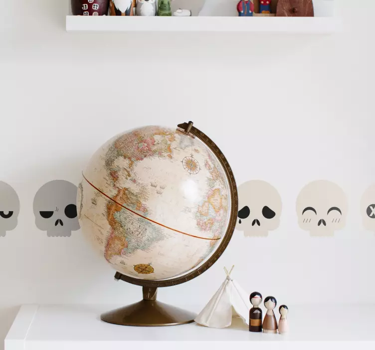 Introducing our stunning Wall sticker whimsical skull faces, a vibrant and playful design that features expressive pirate skulls and charming characters. This decorative border brings a sense of fun to any space, making it a perfect conversation starter for both kids and adults alike!