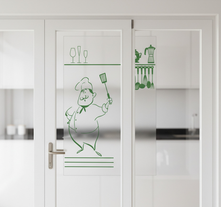 Reference: A53844Transform your space with our Window sticker head chef kitchen set. This stunning sticker features a vibrant and playful design that brings the essence of culinary artistry right to your windows. Crafted with a satin finish, it prevents reflections while enhancing color intensity, ensuring that your kitchen radiates warmth and creativity. Easy to clean and designed for durability, this sticker is perfect for any flat surface!