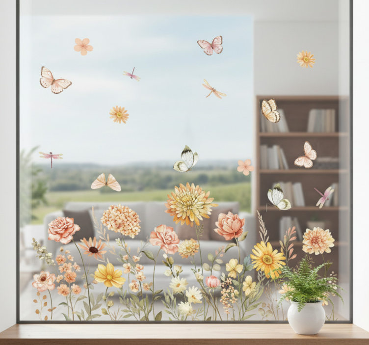 Reference: A53280Transform your space with our Window sticker wildflower meadow with butterflies, a stunning design that captures the beauty of nature in your home! This enchanting sticker features vibrant wildflowers and delicate butterflies, creating a serene atmosphere that brings the outdoors inside. Crafted with a satin finish, our stickers ensure excellent color intensity without any glare, making them perfect for any window or flat surface.