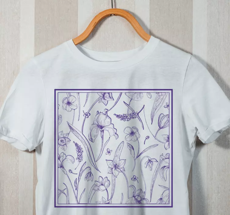 Introducing our stunning Botanical motif arrangement t-shirt, a beautiful blend of nature and art that showcases a delicate crocus design with an array of vibrant flowers. This floral masterpiece features a harmonious purple pattern against a soft background, bringing the essence of nature to your wardrobe. Each illustration is intricately sketched to evoke a sense of tranquility and aesthetic delight, making this shirt a perfect addition for those who appreciate botanical art and florals.