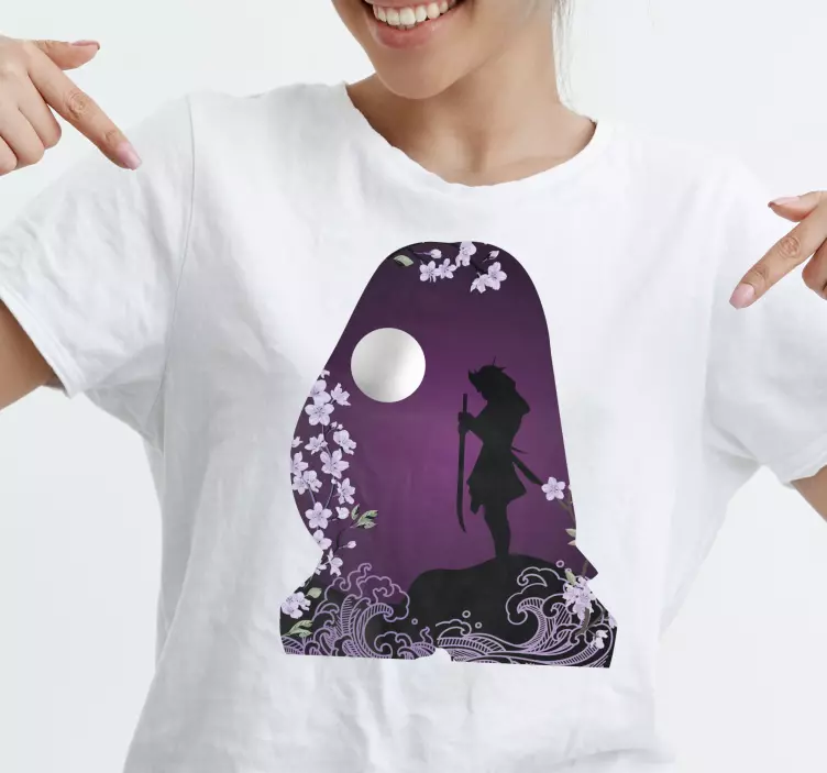 Reference: T4771This stylish piece features a silhouette of a warrior amidst cherry blossoms and a moon on a vibrant purple backdrop. The floral elements add a touch of elegance, making it perfect for expressive individuals who appreciate artistry in their wardrobe.