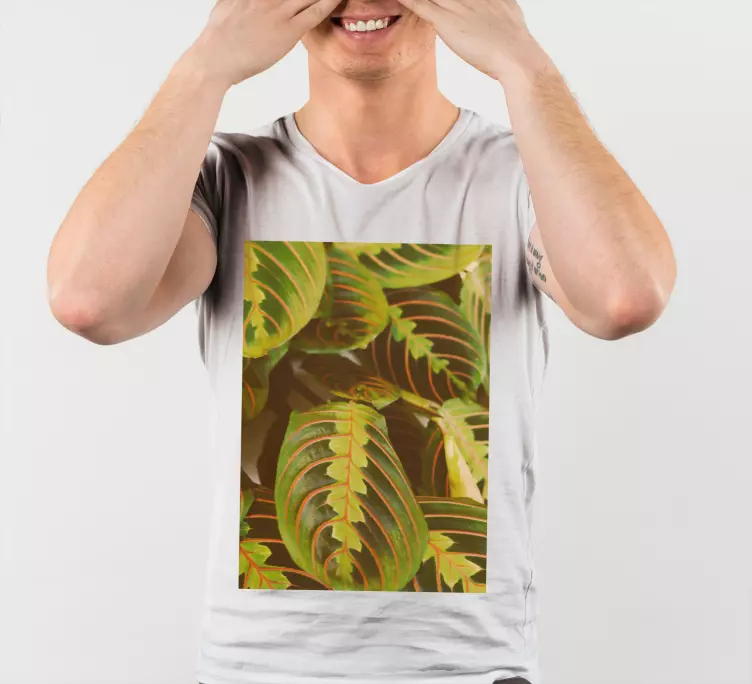 Introducing our stunning Green leaf pattern t-shirt, a vibrant piece that brings the beauty of nature to your wardrobe! This unique design features an exquisite illustration of maranta leaves, evoking the essence of a tropical jungle. The botanical artwork is painted with fresh and exotic hues of green, showcasing a textured look that truly captures the spirit of the wild. Experience the refreshing feel of nature wrapped around you!