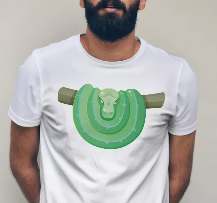 Introducing our stunning Green snakelike design t-shirt, featuring a captivating graphic that showcases a charming illustration of a boa intertwined with a branch. This playful cartoon design is rendered in vibrant shades of green, making it a stylish and unique addition to your casual wardrobe. Perfect for anyone looking to express their love for nature in a fashionable way!