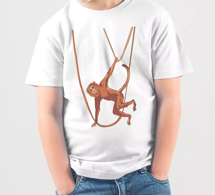 Introducing our delightful Kids t-shirt monkey swinging on a rope, a charming piece adorned with a playful illustration of a monkey swinging joyfully on a rope! This design captures the essence of fun and adventure, featuring a lively ape that embodies the spirit of nature and playfulness. Perfect for children, this t-shirt brings a smile to every young explorer's face!