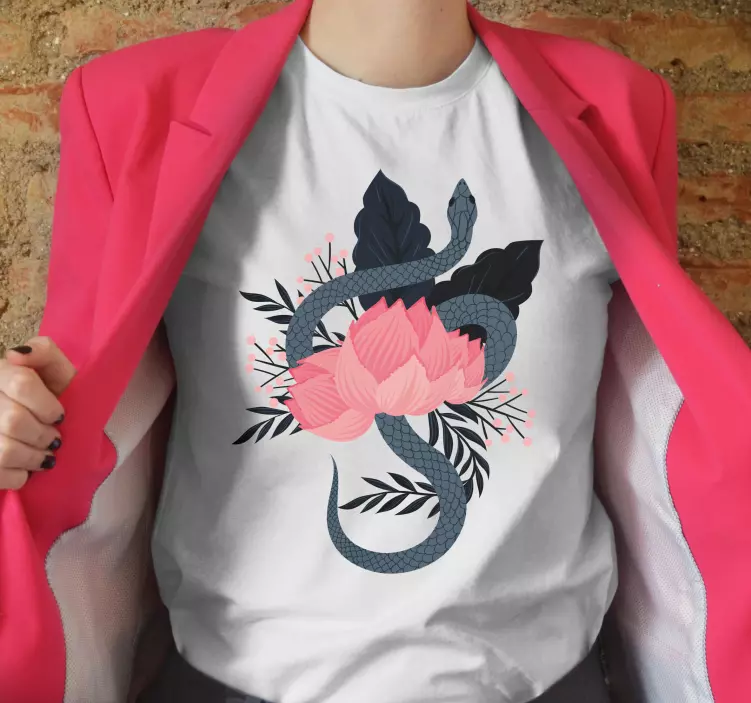 The Snake and flower motif t-shirt showcases a stunning design that intertwines a beautifully stylized snake with a radiant lotus flower, surrounded by delicate leaves and petals. The modern and botanical aesthetic features a striking color palette of pink and black, capturing the essence of nature in a way that is both captivating and contemporary. This unique t-shirt is perfect for those who appreciate artful expression in their wardrobe!