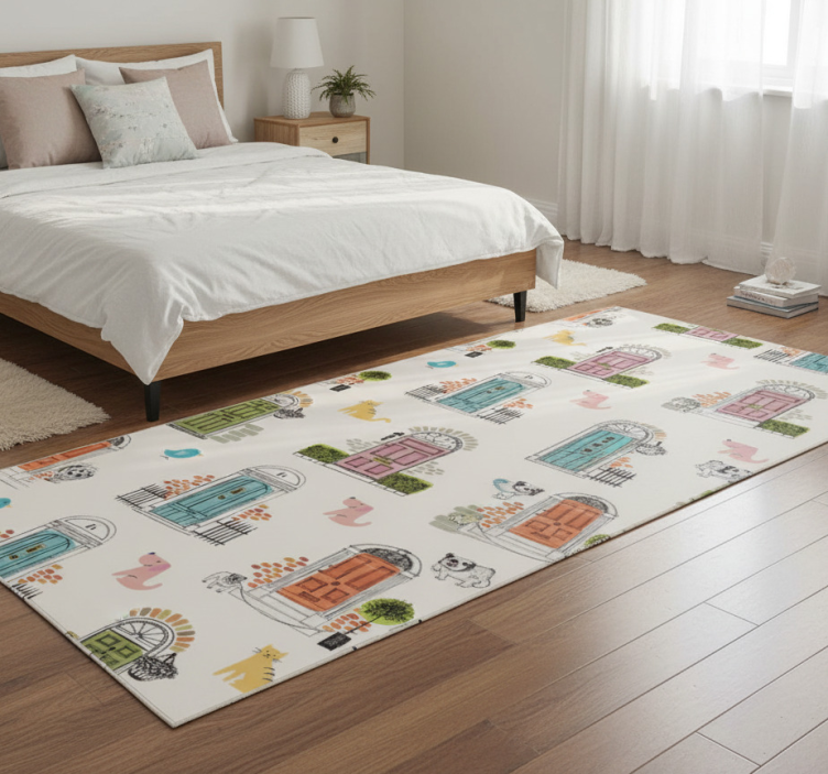 Bedroom vinyl rug with animal and building designs