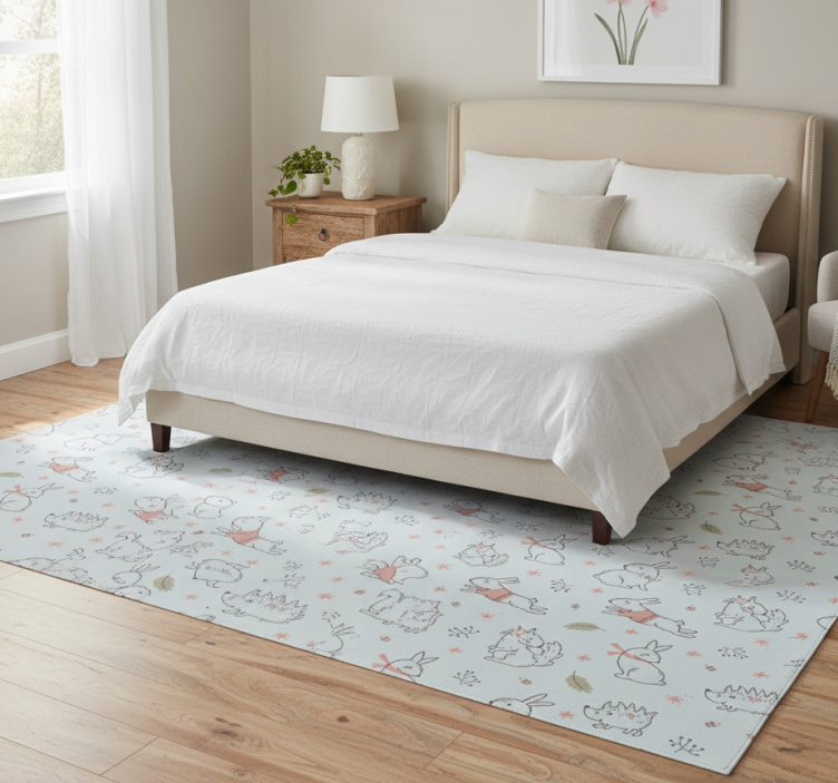 Bedroom vinyl rug with flowers, squirrels, and rabbits