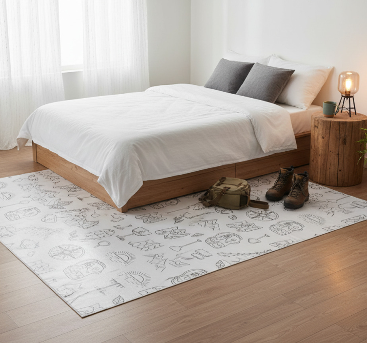 Bedroom vinyl rug with hand-drawn compass and mountains