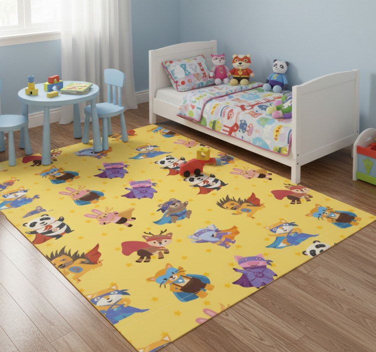 The Bedroom vinyl rug with superhero pets on yellow bedroom vinyl rug is not just a floor covering; it's a statement piece that adds personality to any room. Its playful design inspires imagination and encourages creativity in children while enhancing the overall aesthetic of your home. Perfect for play areas or bedrooms, this rug makes a fantastic addition that elevates your decor!