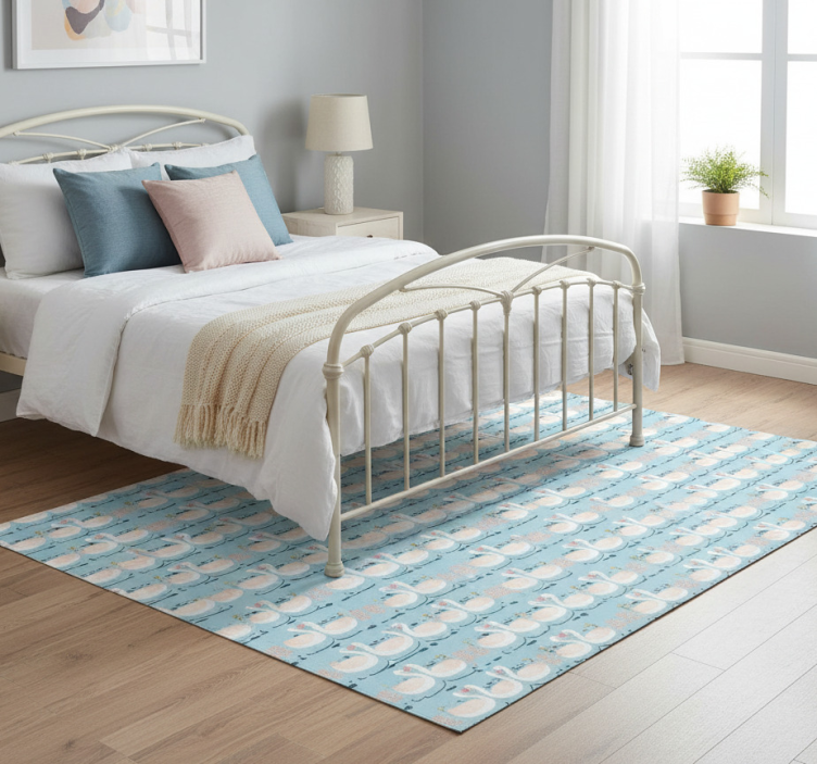 The Bedroom vinyl rug with swans in love on blue bedroom vinyl rug is the perfect choice for anyone looking to elevate their interior decor. Its charming design infuses warmth and personality into your bedroom, creating a cozy retreat where love and comfort coexist. With its eye-catching visuals and soothing colors, this rug is sure to inspire relaxation and joy every time you step into your room!