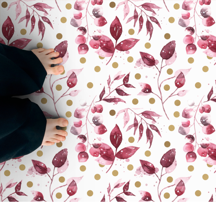 Transform your space with our stunning Floral vinyl rug with botanical print design! This exquisite piece features a rich blend of burgundy, hand painted illustrations, and delicate leaves in a captivating pattern. The watercolour effect brings life to the pink and green tones, while elegant gold accents add a touch of luxury, making it a perfect addition to any decor style!
